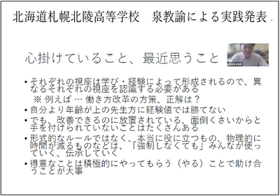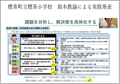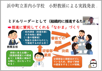 実践発表では、標茶町立標茶小学校 鈴木将太教諭、浜中町立茶内小学校 小野智希教頭、北海道札幌北陵高等学校 泉融希教諭からミドルリーダーに求められる資質能力として「課題解決能力」「同僚性の構築力」の視点から各学校における取組について発表していただきました。