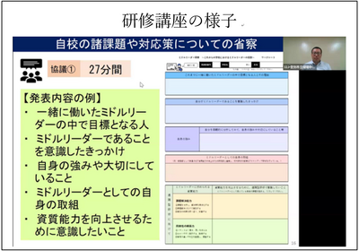 協議・演習では、遠隔型研修後に行われる職場実践に向けて、ミドルリーダーとしての視座から、自身の資質能力の向上に向け、「課題解決能力」「同僚性の構築力」という視点でミドルリーダーとしての役割について理解を深める姿が見られました。